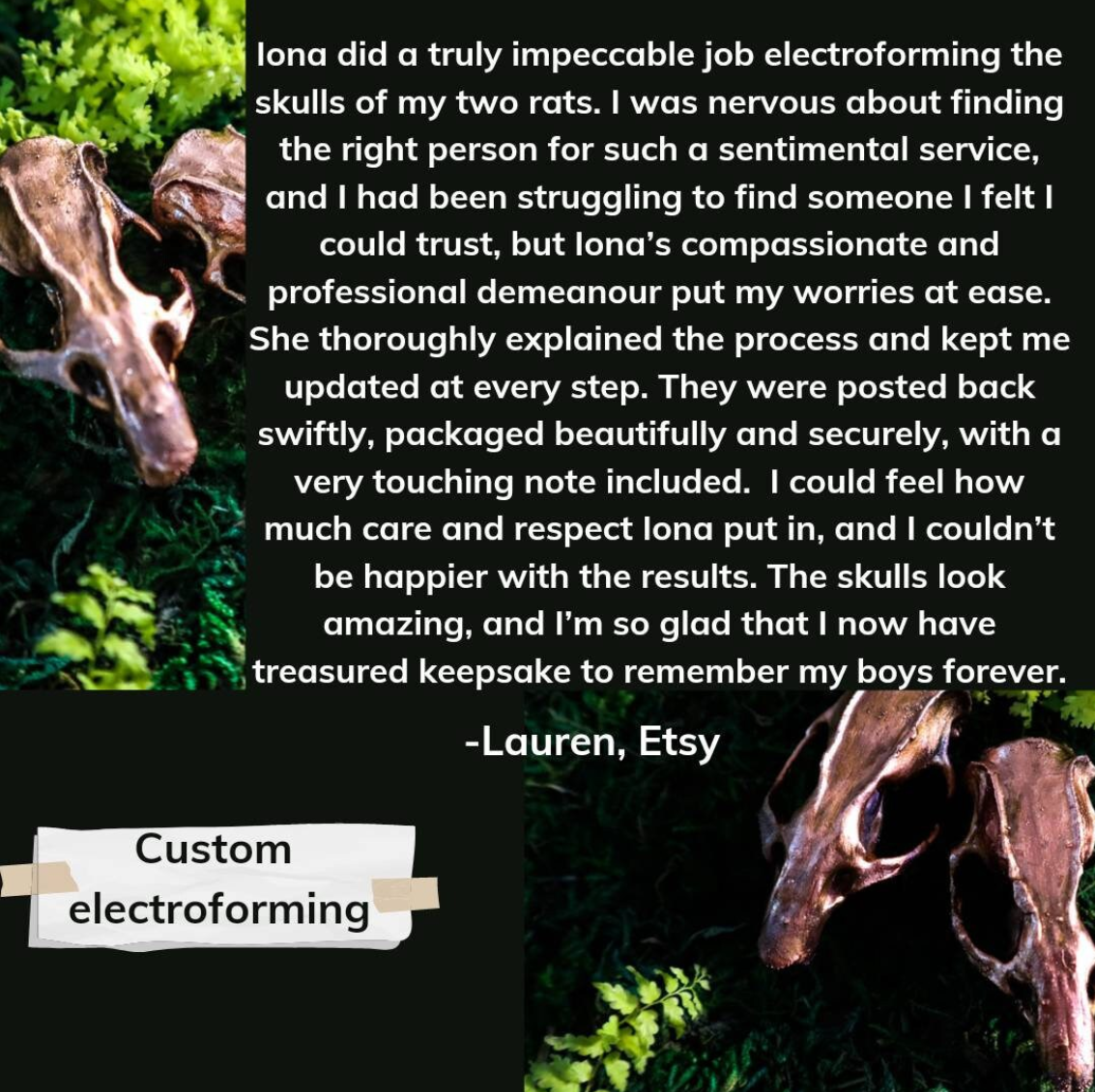 Creating copper electroformed jewellery involves a magical fusion of nature-inspired designs and forest treasures. To begin, ethically sourced bones, preserved insects, and botanical elements are carefully selected to infuse each piece with a touch of whimsical adornments. These organic materials are then meticulously prepared and arranged to form the foundation of the design. Through the electroforming process, copper is delicately layered over these forest oddities, creating a stunning contrast between the natural elements and the metallic sheen. The result is a collection of unique jewellery designs that exude woodland magic and showcase the beauty of fossil creations, plant-inspired pieces, and fossilised wonders. Each piece tells a story of nature's enchanting allure, making copper electroformed jewellery a truly (and literally!) "captivating" art form.