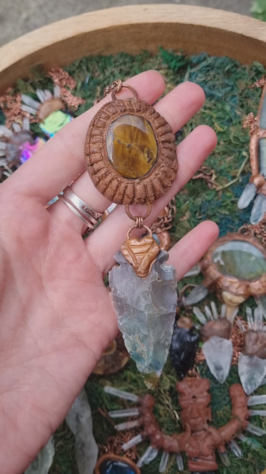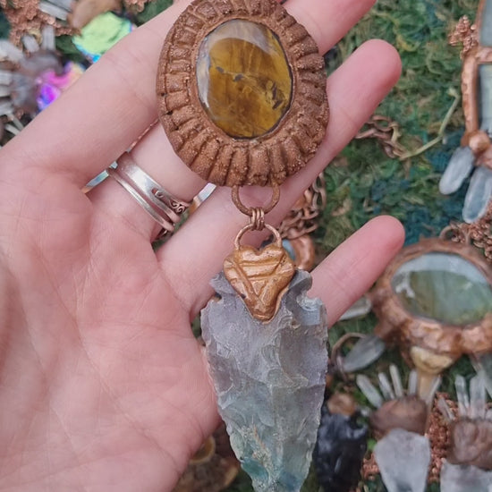 Ancient Sun amulet with tiger's eye and flint stone arrowhead