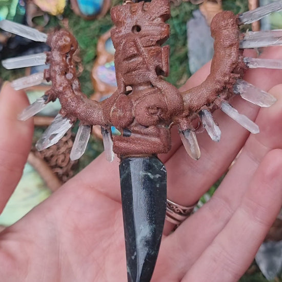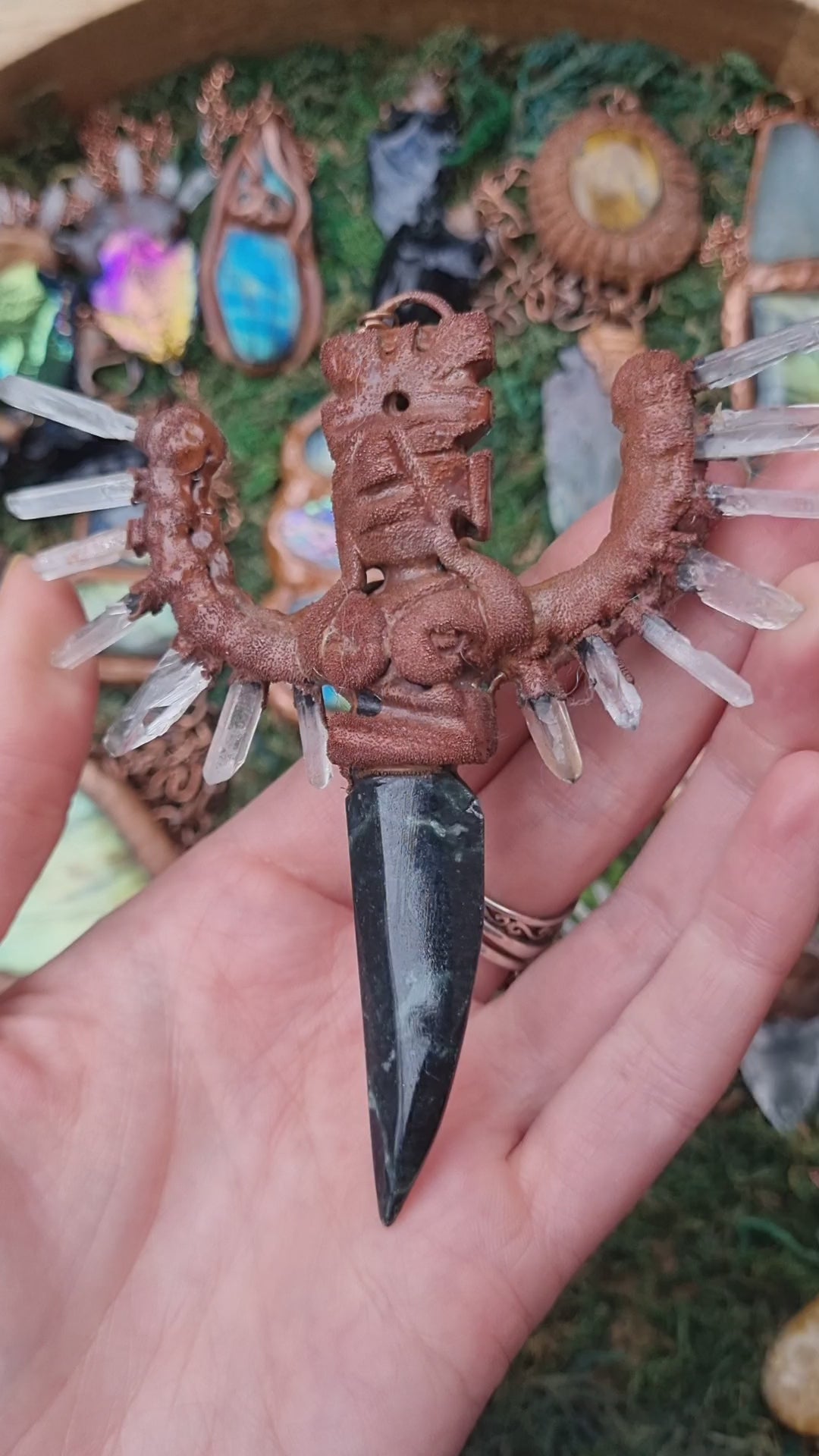 Ancient Winged Grandfather carved obsidian knife, quartz, copper electroformed