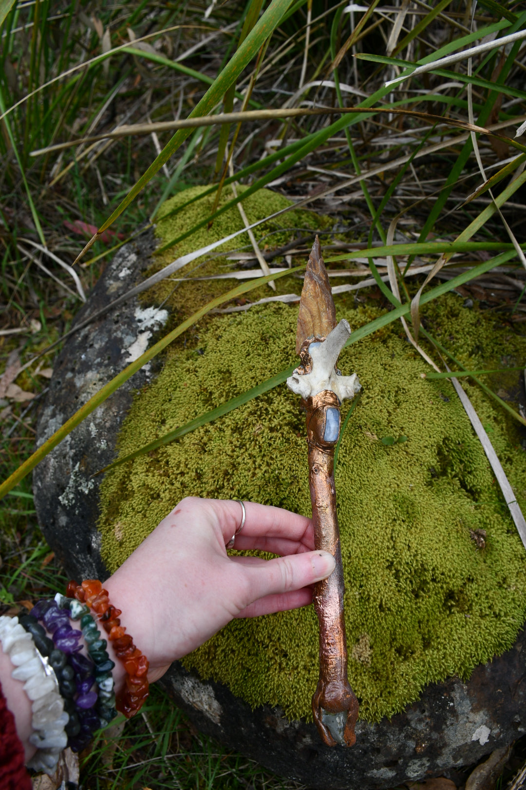 1. Obsidian moon, blue-grey flint and eucalyptus handle. A moonstone and a python vertebrae hanging on the side. Clear lemurian quartz points direc energy forward and the hilt has a spherical selenite. Copper electroformed.