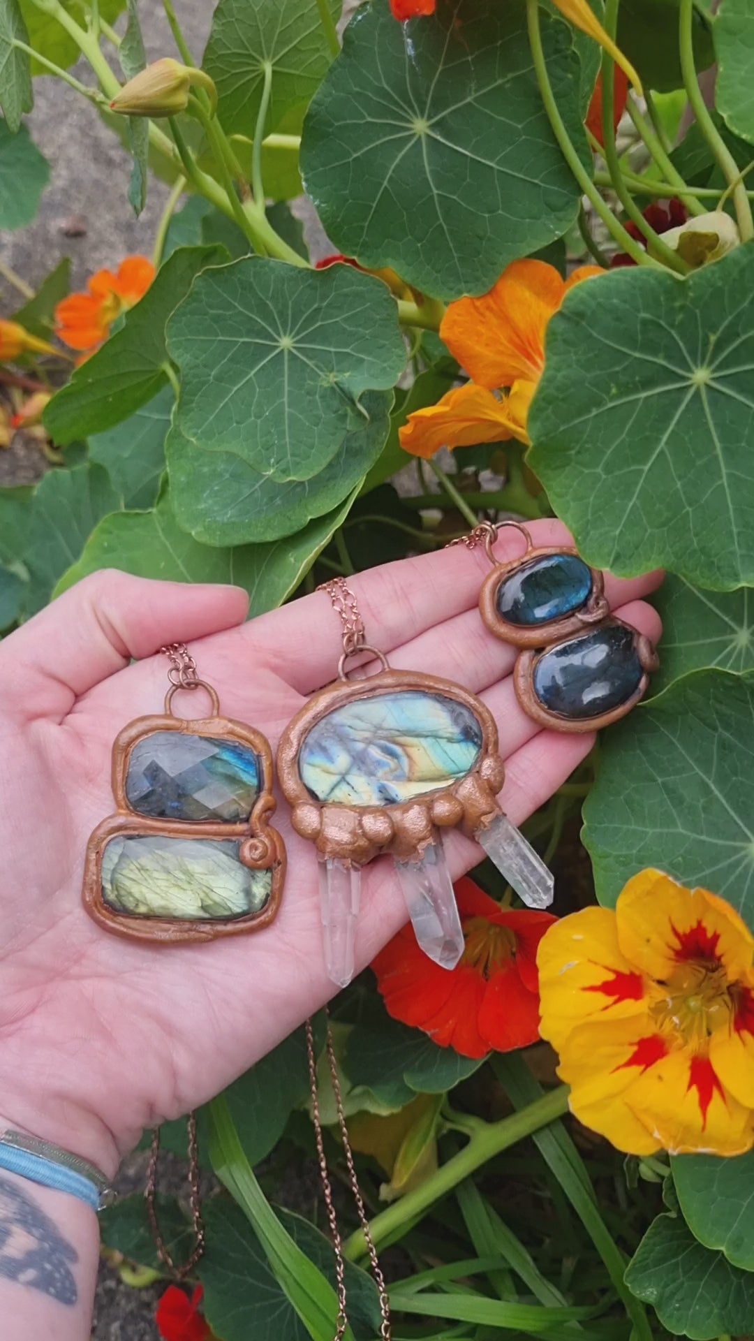 I have paired a blue green labs with beautiful copper. Quartz points radiate from the unusually shaped Labrodorite. It was inspired by the way the light ripples in the Cenotes of Mexico. Particularly the cenote I swam in, Dos Ojos or "two eyes".